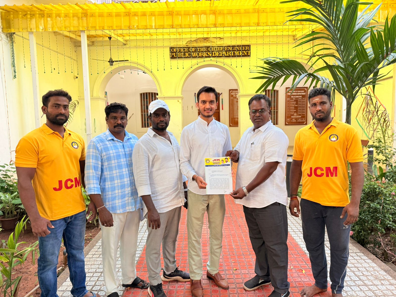 JCM மக்கள் மன்ற தலைவர் ரீகன் ஜான்குமார், சமூக சேவகர் சார்லஸ் மார்டின் அறிவுறுத்தலின்படி லால் பகதூர் சாஸ்திரி வீதியில் உள்ள பொதுப்பணித்துறை தலைமை பொறியாளர் அலுவலகத்திற்கு JCM மக்கள் மன்ற நிர்வாகிகளுடன் வந்து மனு ஒன்றை அளித்தார்,