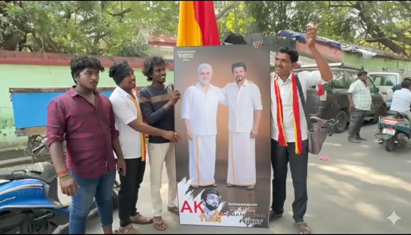 இதனை கேட்பதற்காக புதுச்சேரியின் பல்வேறு பகுதிகளை சேர்ந்த ஏராளமான தமிழக வெற்றி கழக தொண்டர்கள் கலந்து கொண்டனர். இந்த கூட்டத்தில் அஜித் ரசிகர்களும் கலந்து கொண்டனர். அப்போது அவர்கள் விஜயும் அஜித்தும் தோல் மீது கை போட்டு நிற்பது போன்ற பேனர்களை வைத்து படி கூட்டத்தில் பங்கேற்றனர். அப்போது அவர்கள் தல வாழ்க தளபதி வாழ்க என கோஷமிட்டபடி கூட்டத்தில் கலந்து கொண்டனர். ஏ.கே என்ற பேனருடன் கலந்து கொண்ட அஜித் ரசிகர்களின் வீடியோ தற்போது இணையத்திலும் வைரலாகி வருகிறது.