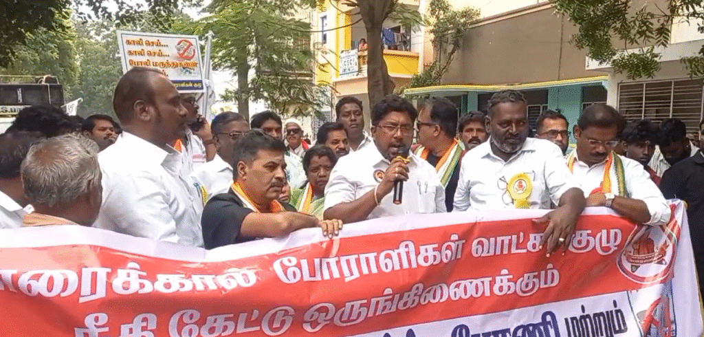 புதுவையில் கோடிக்கணக்கான போலி மருந்துகள் பிடிபட்ட சம்பவம் நாடு முழுவதும் பரபரப்பை ஏற்படுத்திய நிலையில் போலி மருந்து தொழிற்சாலையை கண்டித்தும் இது தொடர்பாக புதுவை அரசு விசாரணை நடத்த வலியுறுத்தியும் இன்று காரைக்காலில் மாவட்ட ஆட்சியர் அலுவலகத்தை நோக்கி கண்டன பேரணியில் 200க்கும் மேற்பட்டோர் ஈடுபட்டனர். புதிய பேருந்து நிலையத்திலிருந்து மேளம் அடித்துக் கொண்டு மாவட்ட ஆட்சியர் அலுவலகத்தை நோக்கி பேரணியாக சென்றனர். முன்னதாக கண்டன பேரணியில், புதுவையில் போலி மருந்து தொழிற்சாலைகள் மற்றும் மௌனம் காக்கும் புதுவை முதல்வரை கண்டித்து போராட்டக்காரர்கள் கண்டன கோஷங்களை எழுப்பினர். இந்த கண்டன ஆர்ப்பாட்டத்தில் காரைக்கால் JCM மக்கள் மன்றம் சார்பில் வடக்கு கிளை தலைவர் முருகானந்தம், தெற்கு கிளை தலைவர் அப்துல் பாசித், நெடுங்காடு கோட்டுச்சேரி கிளை தலைவர் ஆறுமுகம் ஆகியோர் கலந்து கொண்டு புதுவை அரசுக்கு எதிராகவும் முதல்வரை கண்டித்தும் கண்டன கோஷங்களை எழுப்பினர்.