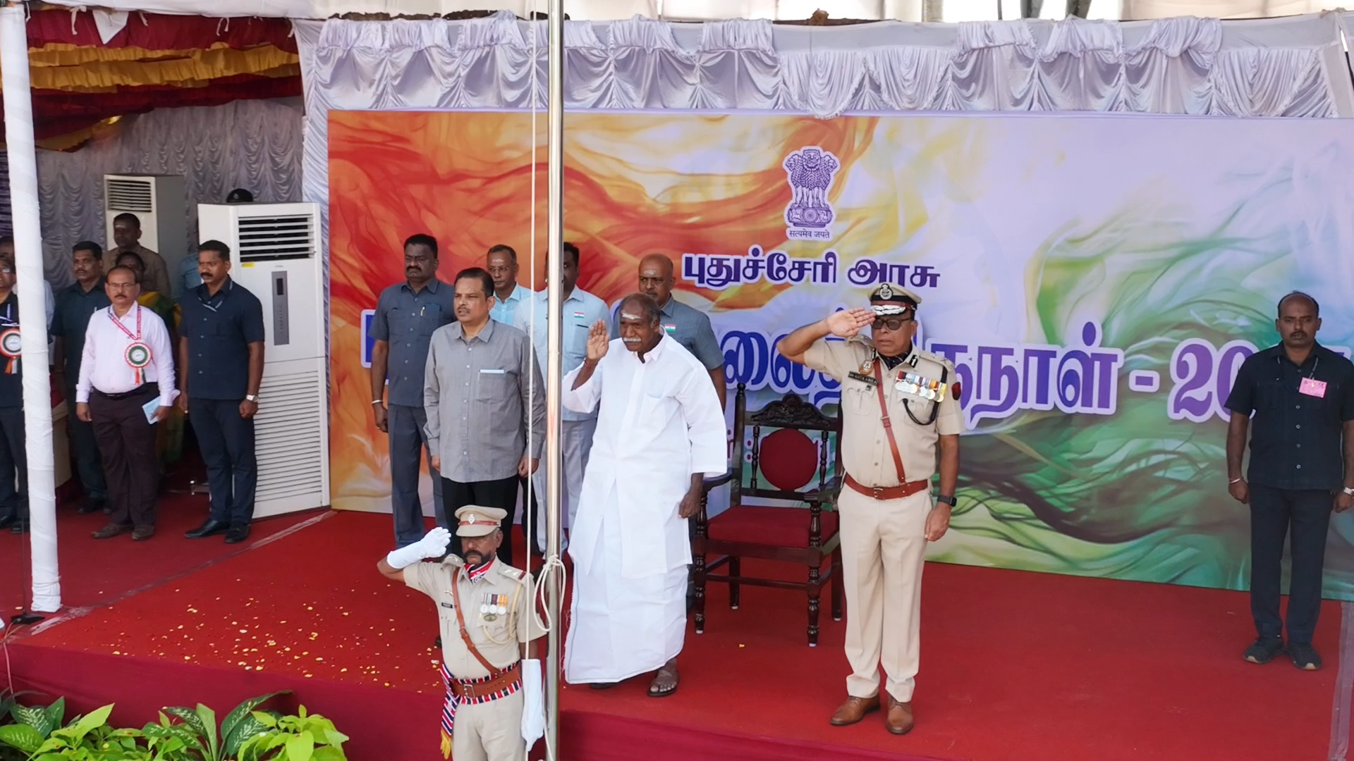 புதுச்சேரி விடுதலை நாள் விழாவை முன்னிட்டு, மாநில முதல்வர் என். ரங்கசாமி அவர்கள் இன்று காலை கடற்கரை மைதானத்தில் தேசியக் கொடியை ஏற்றி, காவல்துறை மற்றும் தேசிய மாணவர் படையினரின் அணிவகுப்பு மரியாதையை ஏற்றுக்கொண்டார்.
