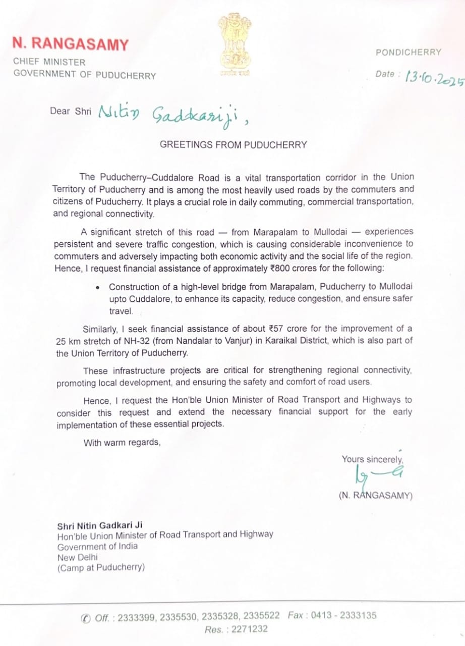 புதுச்சேரி முதலமைச்சர் ரங்கசாமி மத்திய சாலை போக்குவரத்து மற்றும் நெடுஞ்சாலைத்துறை அமைச்சர் நிதின் கட்கரிக்கு கடிதம் எழுதி, புதுச்சேரி-கடலூர் சாலை மற்றும் NH-32 பகுதியின் மேம்பாட்டிற்கு சுமார் 957 கோடி ரூபாய் நிதி உதவி கோரிக்கை வைக்கிறார்.